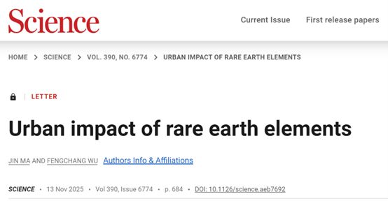 2025年11月13日,国际顶尖学术期刊《Science》(科学)在其“Letters”栏目发表了我院吴丰昌院士团队文章,该文章聚焦全球前沿环境挑战,就城市环境中稀土元素富集及其健康风险提出了深刻洞见和应对策略。